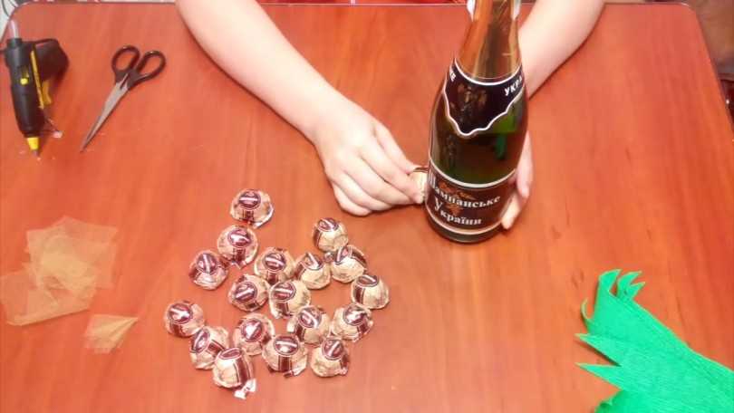 Шампанское и конфеты оптимально подходят для изготовления подобных подарков, поскольку отвечают сразу двум требованиям: