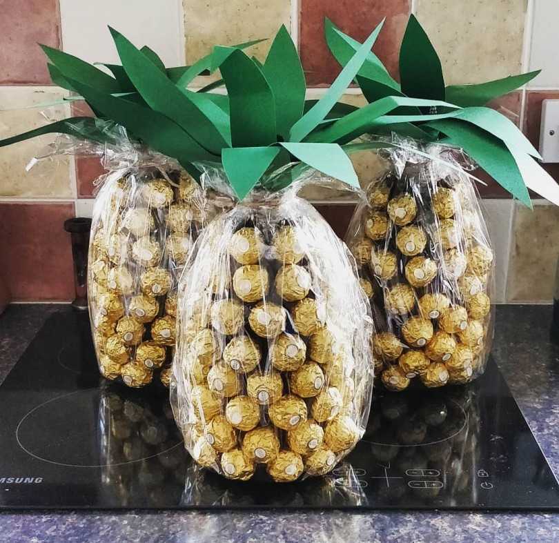 Из пластиковой бутылки делается ананас. Бутылка разрезается поперечно на 2 равные половины. Обе половины заполняются конфетами. Чтобы ананас выглядел реалистично, цвет фантиков подбирают жёлтого, зелёного или коричневого цвета. Обе половины соединяют, фиксируют при помощи ленты.