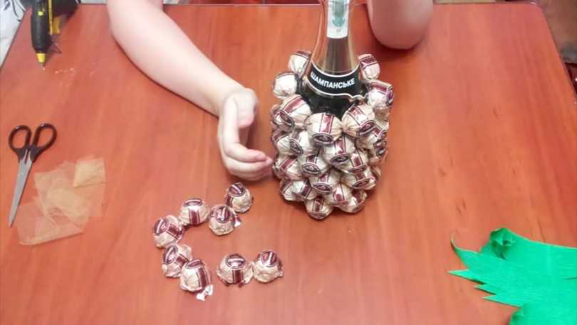 Для создания хенд мейд из шампанского в виде ананаса нам потребуются конфетки желтого, золотистого, оранжевого или светло-коричневого цвета, круглой или овальной формы, которые легко складываются в шахматном порядке и имитируют чешуйки экзотического фрукта. Особенно тщательно выбираем напиток, не забывая о предпочтениях близкого человека.