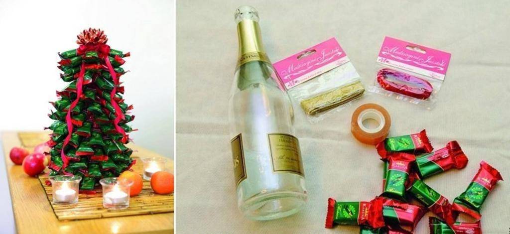 Если вы раздумываете, как красиво украсить бутылку шампанского конфетами, то рекомендуем второй способ. В данном случае бутылка праздничного напитка будет похожа на новогоднюю елку. Что само по себе символично.