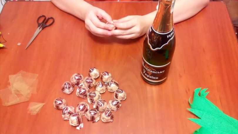 - Прилепить лакомства к основе. Можно обработать сладость так, как и для бутылки, но это не обязательно. При креплении конфет на скотч кончики обертки нужно сразу подвернуть внутрь.