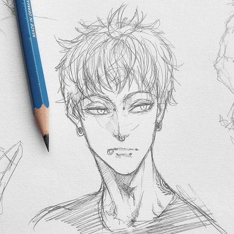 Лицо парня в пол-оборота подчеркивает его мужественность. Тонкие губы и узкие глаза более тщательно прорисовываются.
