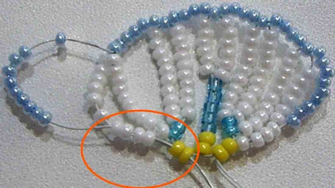 - Нанизываем на один конец 3 желтых бисерины, синих, сколько войдет до другого края, если уложить проволоку вокруг петельки и 3 желтых, сделать скрутку.