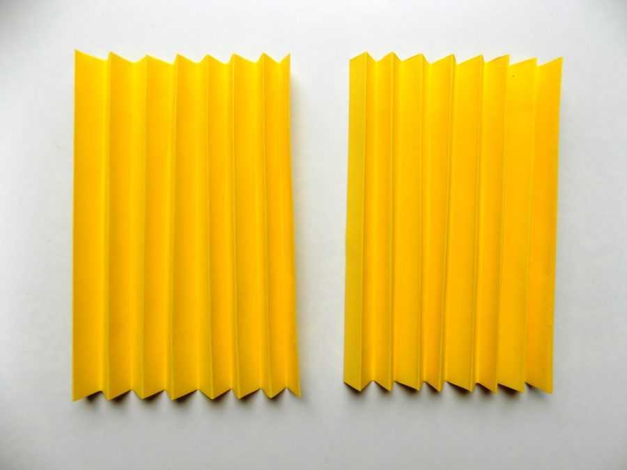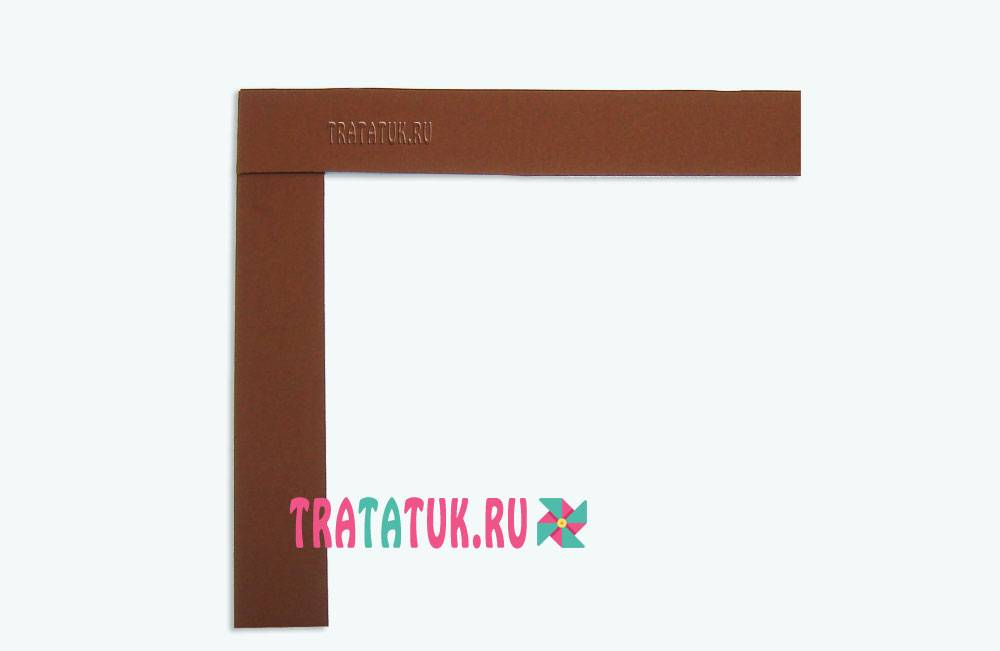 Одну из них, например, желтую, складывают пополам под углом 30° так, чтобы правый конец был заведен за основную (красную). Затем правый же конец основы заводится за ближняя часть желтой полоски и сгибается так, чтобы загнутый отрезок плотно прилегал к левому концу второй полоски.