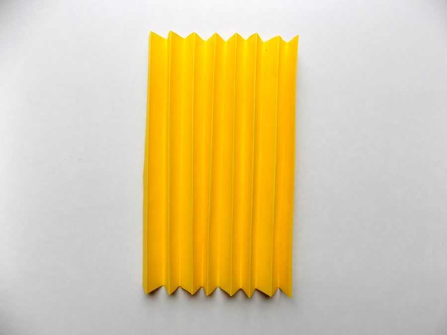- Вывернуть вверх средний слой бумаги (нижний сгиб вытянуть наверх по всей длине заготовки), согнуть левый край по намеченным сгибам вправо;
