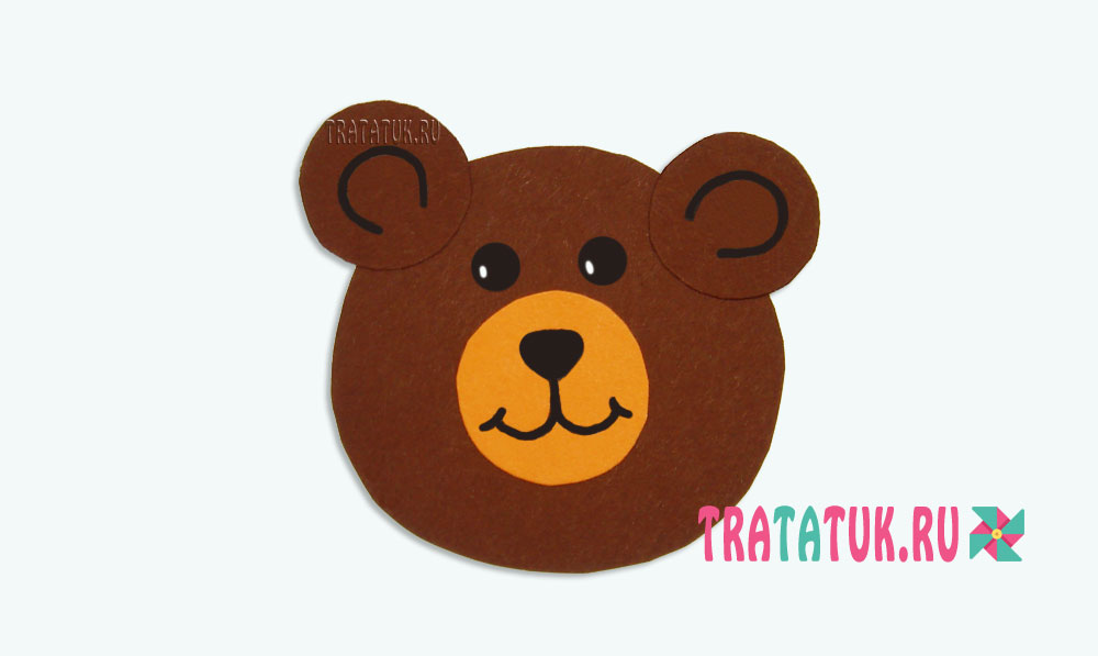 Приклеиваем оранжевые детали на коричневый силуэт головы медведя. На центр прикрепляем пластиковые глазки.