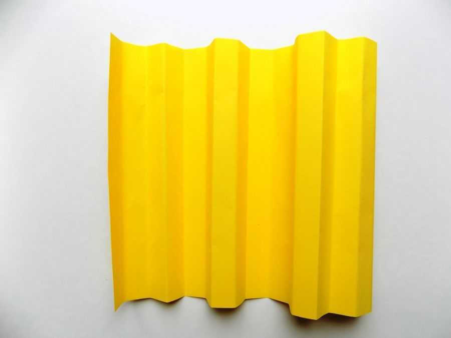 - Сложить его по диагоналям: правый верхний угол совместить с нижним срезом центрального перегиба, а нижний – с верхним.