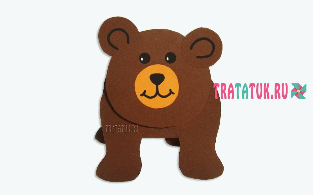 На этом красивый и добрый медведь из цветной бумаги готов. Благодаря хорошей конструкции в виде трубочки такая поделка статична и может стоять на ровной поверхности.