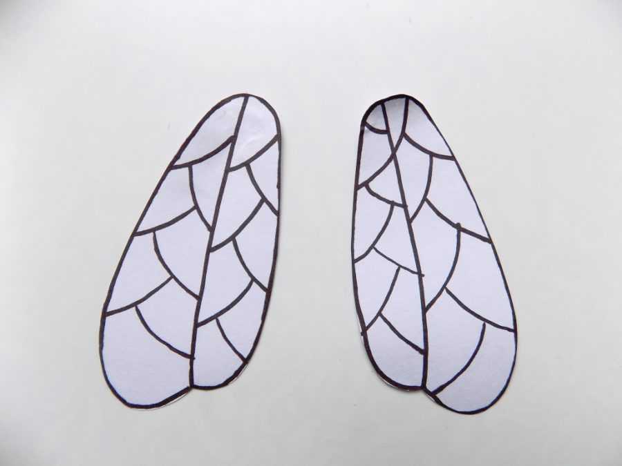 - Чтобы соединить крылышки между собой, проколите одно из них иглой в месте, отмеченном на выкройке жирной точкой. Зафиксируйте конец нити двумя крепкими узлами. Не отрезая нити, проколите второе крылышко в таком же месте. Снова завяжите несколько крепких узлов. Отрежьте нить. В процессе соединения крылышки должны быть опущены вниз. Соединяющая их нить должна располагаться горизонтально — не провисать, но и не быть сильно натянутой.