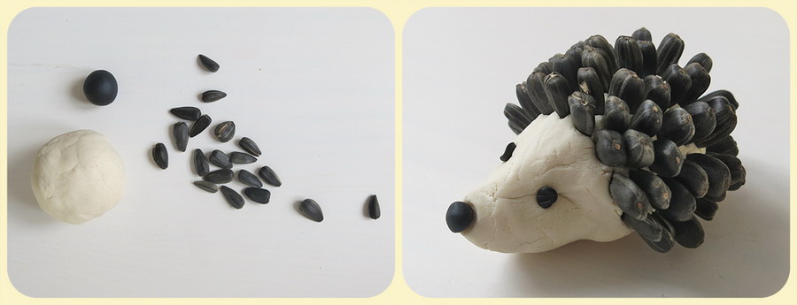 Сделаем иголки из семечек подсолнуха либо арбуза. Заостренную часть погрузим в коричневый пластилин на спинке ежика, слегка вдавим. Так последовательно заполним семечками все пространство.