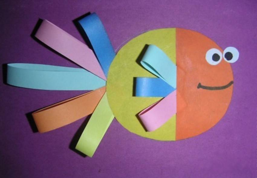 От центра круга прочертить при помощи линейки треугольник (углом во внутрь круга), разрезать его — это рот рыбы. Его приклеить в качестве хвоста с параллельной стороны от рта.