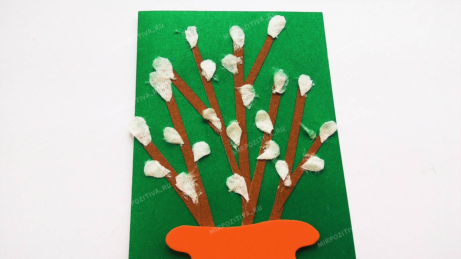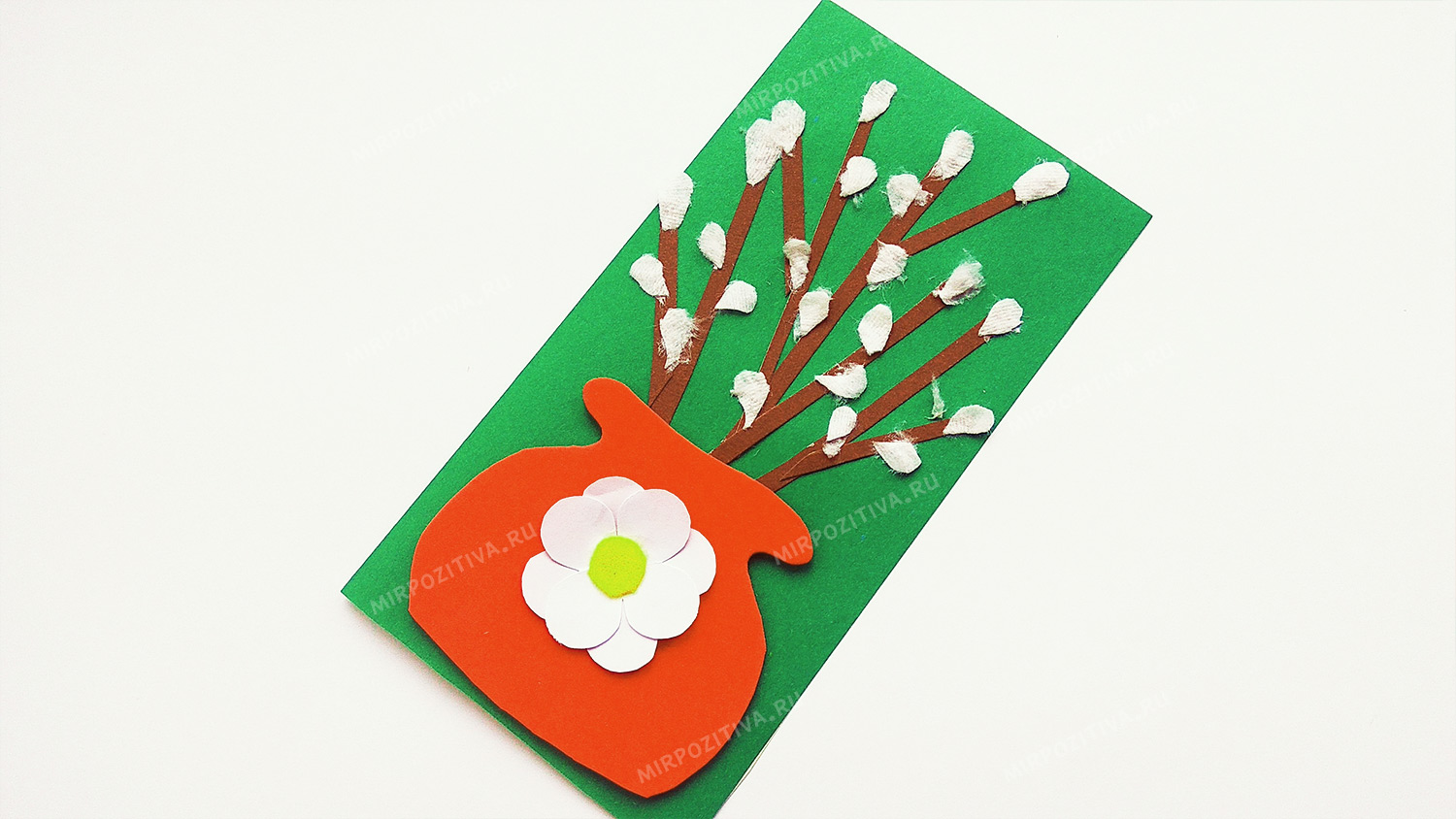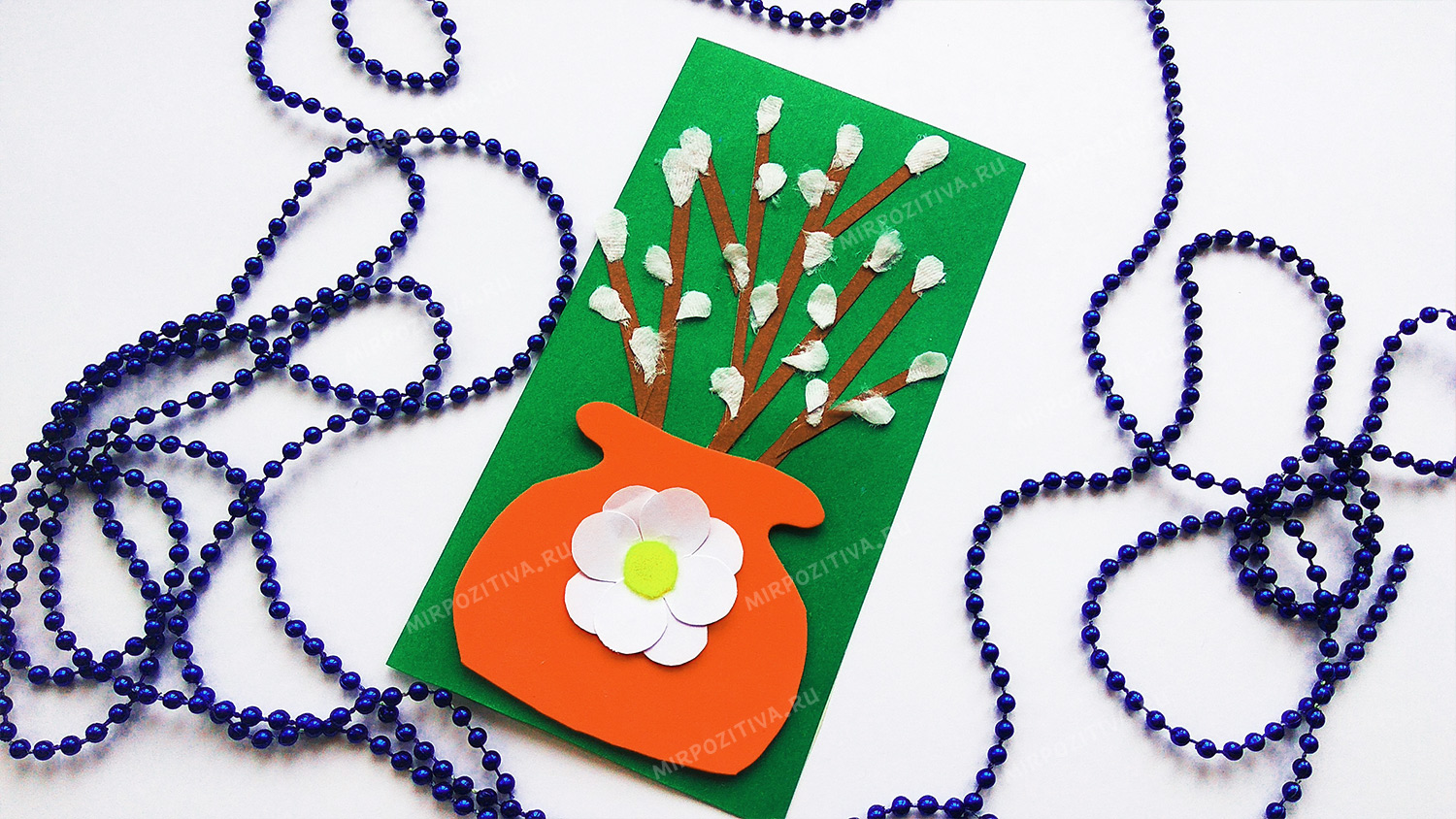 Веточка вербы вазе в виде аппликации – это замечательная детская поделка пасхальной тематики. Можно выполнить ее из бумаги, а самих вербных котиков выполнить из ватных дисков. Предлагаем вам рассмотреть пасхальную поделку для детей легко выполнимую, яркую и необычную.