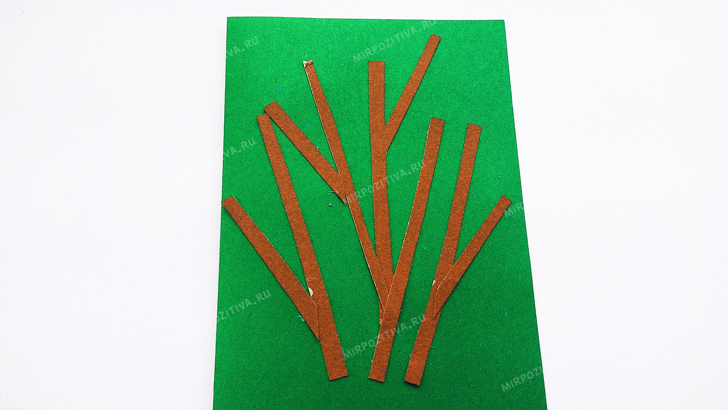 Шаг 4. Подготовленный лист коричневой бумаги нарежьте соломкой и наклейте эту соломку в верхней части аппликации так, чтобы сделать имитацию веточек, то есть используйте полоски разной длины. Крепите их на разных уровнях.