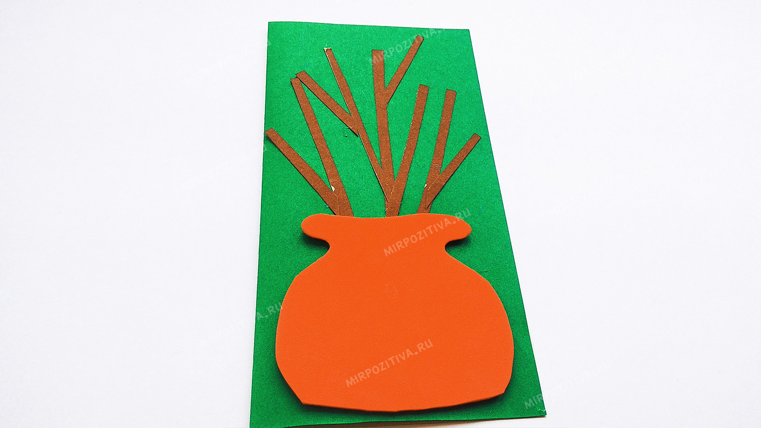 Шаг 5. Снизу к этому букету подклейте вазу так, чтобы оставалось впечатление, что веточки выходят из горлышка вазы.