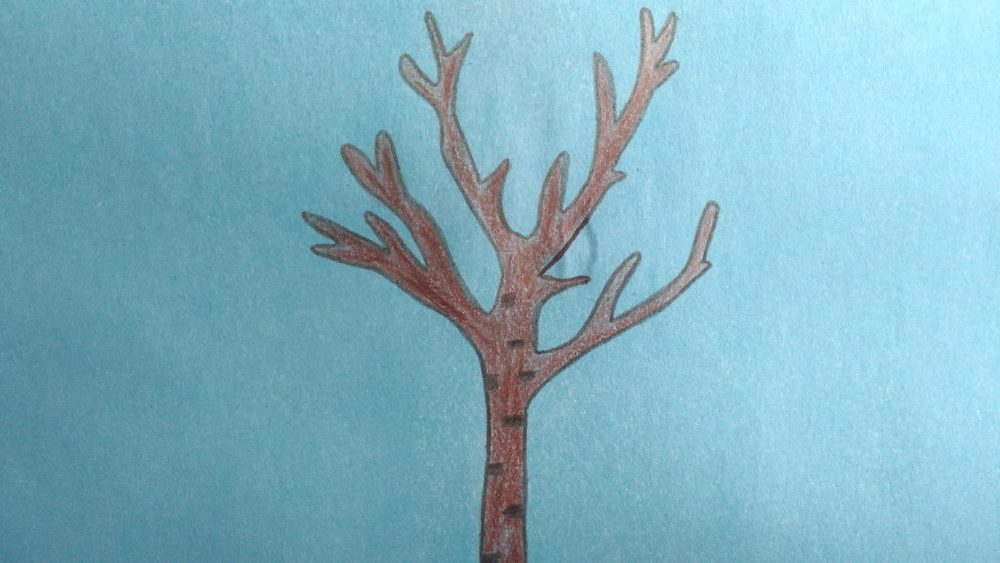 На фоновом листе раскрасьте по шаблону дерево цветными карандашами разных оттенков коричневого цвета.