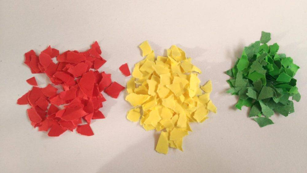 Возьмите цветную бумагу красного, желтого, салатового колеров. Порвите ее на мелкие клочки произвольной формы.