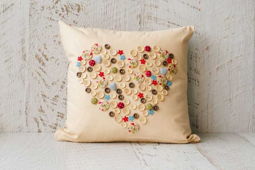 Пуговицы прекрасно подойдут для декорирования диванных подушек. Изготовьте свой цветущий луг! Или создайте думку, украшенную элементами швейной тематики.