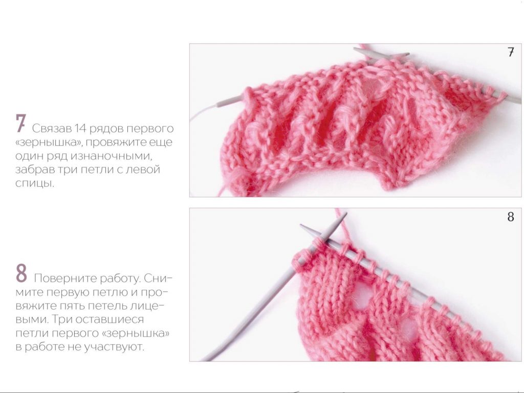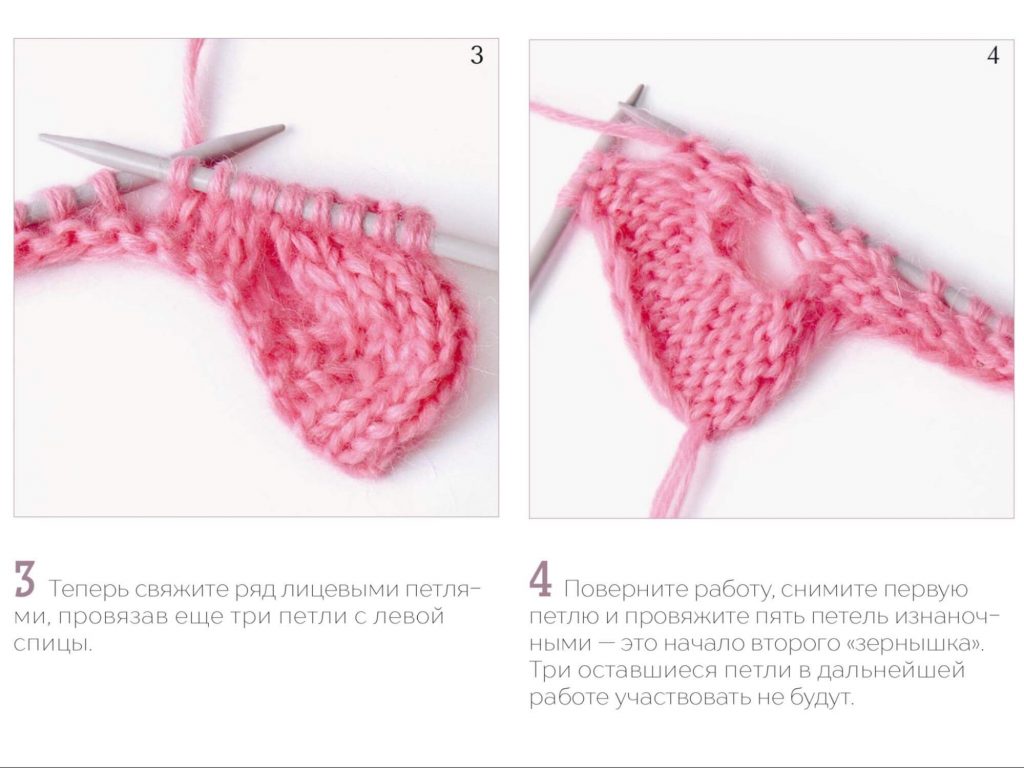 - Когда последний изнаночный рядок провязан, зернышко ввязывается в общее полотно, для этого к 6 добавляют еще три петли. Затем вязку переворачивают.