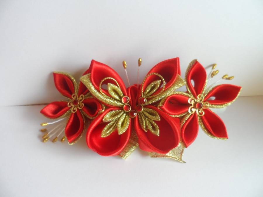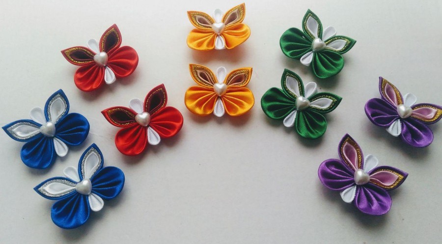 При использовании техники канзаши потребуются ленты двух разных видов шириной 5 и 10 см, отрезок ленты 5 см в длину и ширину другого цвета, квадратный кусочек ленты со стороной в 2,5 см.