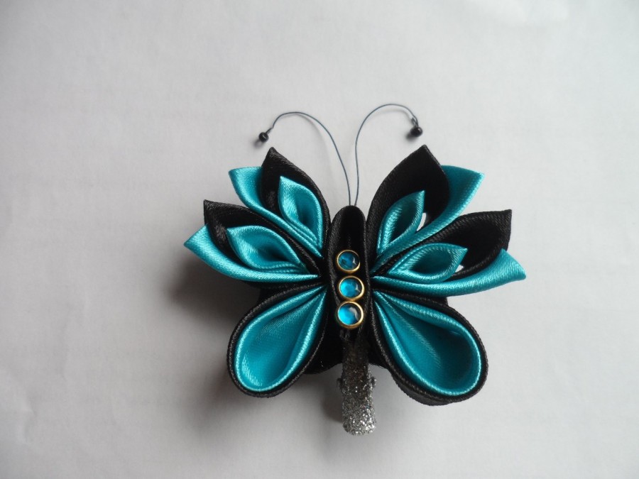Тело бабочки сделать из крупных бусин и бисера, как показано на фото самодельной бабочки. Совместить тело и крылья, прошить ниткой.