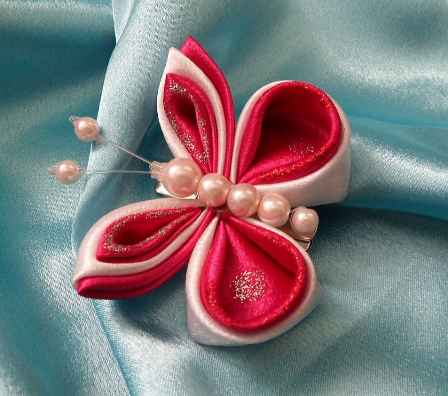 Можно подготовить «подушку» из кружева: смотать кружево в клубок без внутреннего отверстия, потом расправить равномерно складки. На кружевную «подушку» наклеить бабочку канзаши, так получится более объемная поделка.