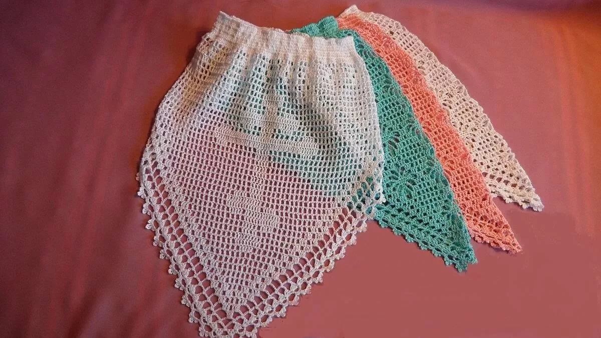 Работа завершается, когда косынка достигает нужных размеров. Если обвязать получившееся изделие крючком по кромке или обшить косынку лентой, получится оригинальное изделие.