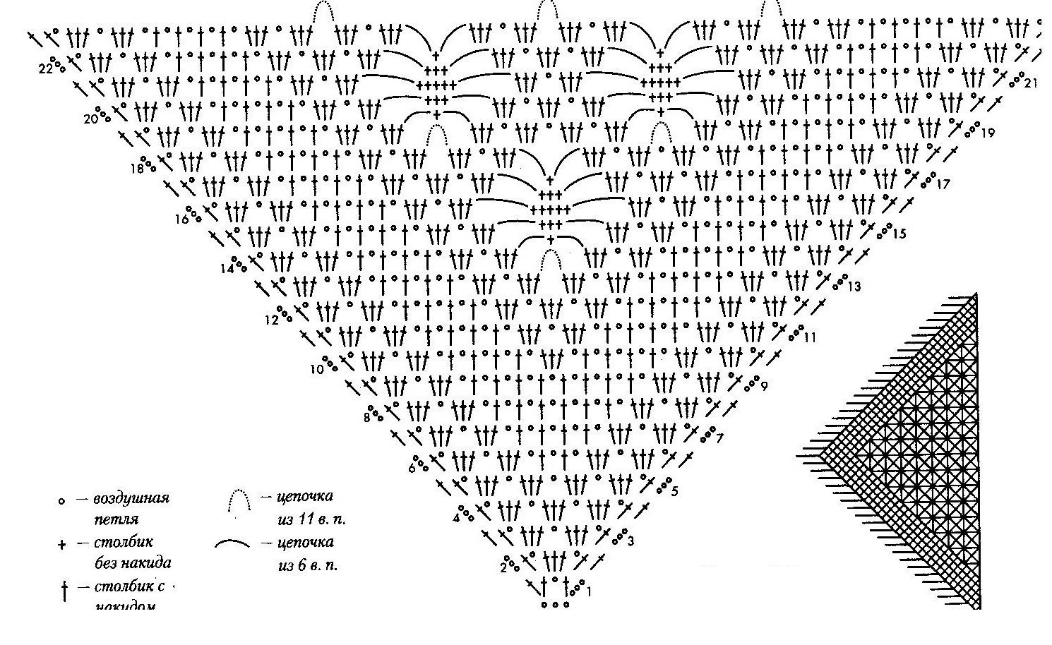 Некоторые журналы предлагают схемы для ажурной части и канвы – по готовности детали сшивают, от чего образуется шов, заметный при носке косынки. Такой вариант неприемлем, особенно на легких косынках, поэтому лучше не прибегать к сборным схемам вязки. Начинающим мастерицам проще будет ориентироваться при вязке изделия сверху, схему в таком случае можно просто перевернуть.