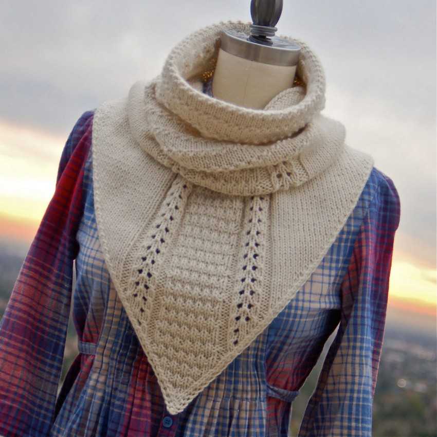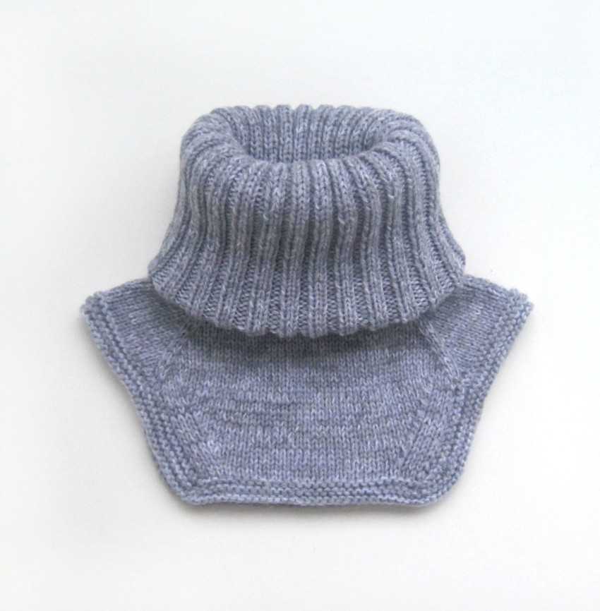Теперь нужно набрать петли на круговые спицы по краю получившейся косынки, и вязать ворот примерно 18 см резинкой 2 на 2. Закрыть петли не туго, чтобы край был эластичным и голова проходила легко. Вот что, примерно, должно получиться в итоге.
