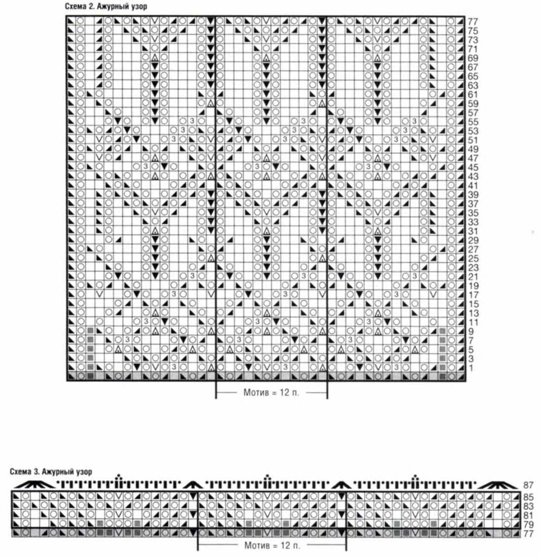 На спицы 3 мм. набрать 167 пет. и вязать 3 ряда лиц. пет. Затем – основной узор (схема № 1) всего 192 ряда (64 см).