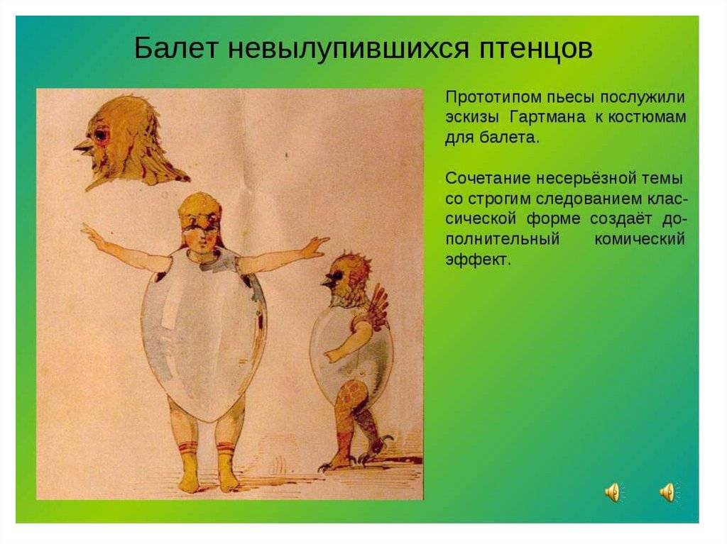 А композитор Модест Петрович Мусоргский знал не только, где живут не вылупившиеся птенцы, но и что они делают. Он сочинил целую музыкальную историю про не вылупившихся птенцов. Хотите ее послушать?