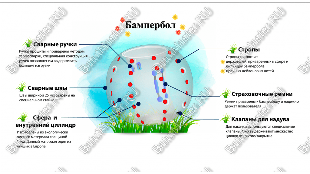 Пользователь, игрок, находящийся внутри бампербола пристегивается страховочными ремнями, а для удобного положения рук имеются специальные ручки.