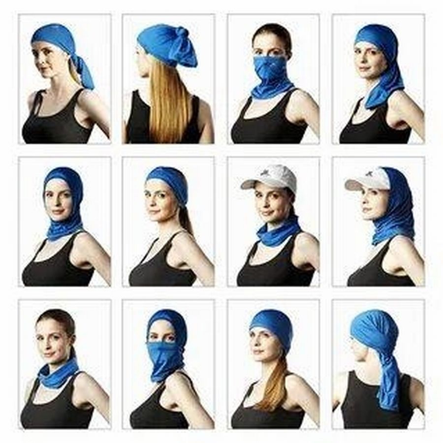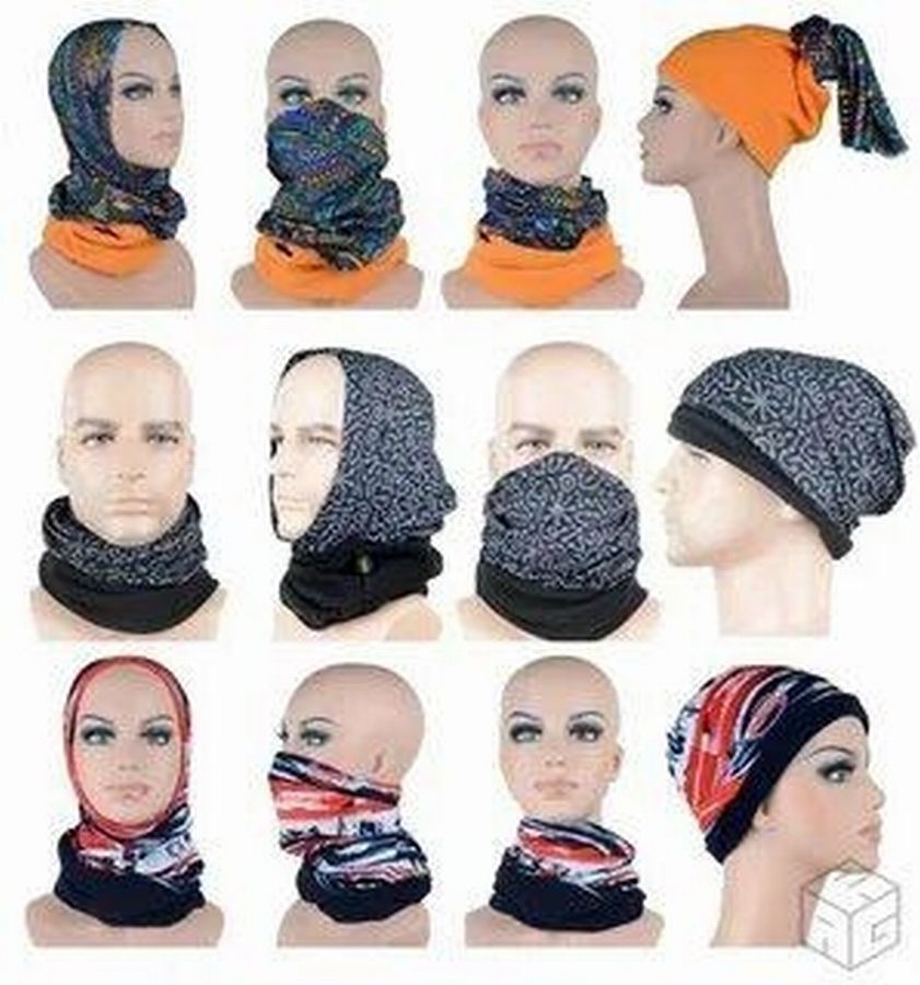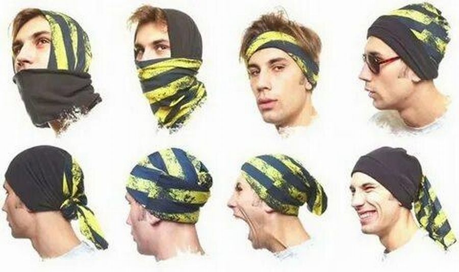 Если бандана-бафф сшита из двух частей трикотажа разных расцветок, носить ее можно многими способами. Что очень нравится молодым людям и парням, и девушкам.