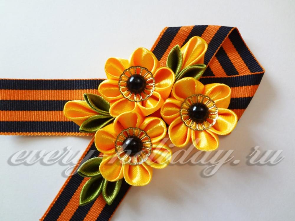 Ленту красного цвета можно заменить желтой или розовой, такой цветок Канзаши также прекрасно сочетается с георгиевской лентой: