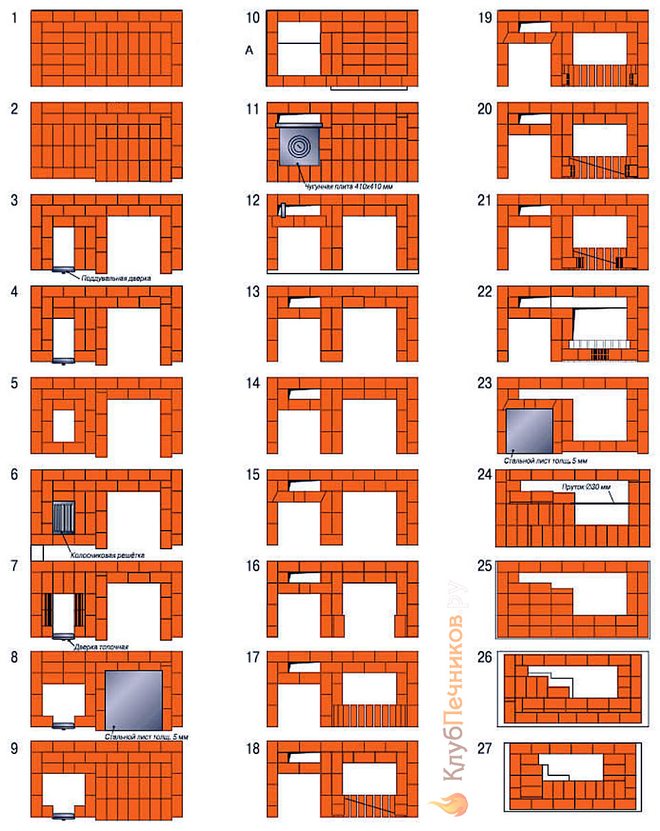Летняя кухня с уличной печью или конфорочной плитой – обычное дело в наших краях. Объединяются они в одно с барбекю без каких-либо особых сложностей, только мастеру теперь нужно быть каменщиком-самодельщиком средней квалификации и знать азы печного дела. Порядовка такой печи приведена на рис. Принцип кладки голландский, т.е. без обязательной перевязки швов в рядах. Раствор – глиняный, как вообще для печей, но кирпич обычный красный, не шамотный.