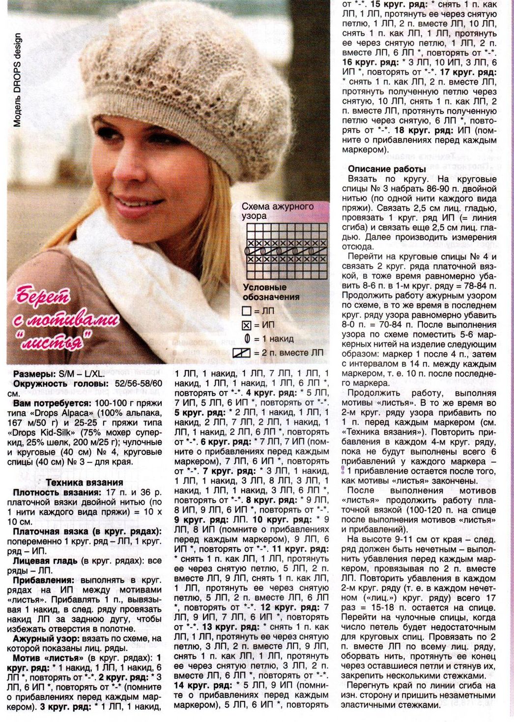 | Схема и описание вязаного берета для женщины листьями | 194 | Как связать спицами берет из мохера: схемы и описание. | |