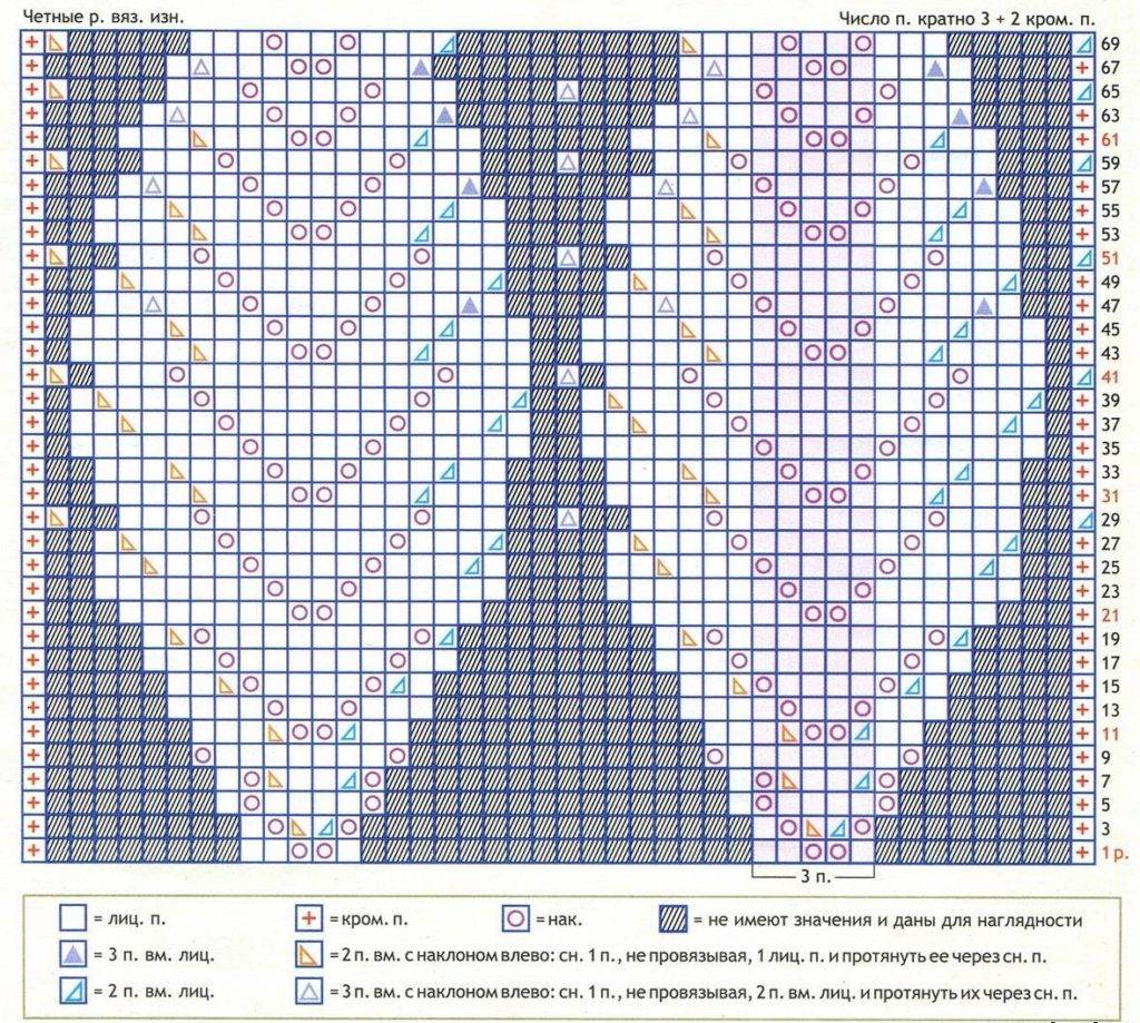 Вяжется берет вкруговую, повторяя диаграмму с 1-го по 45 р. С обоих сторон последние 3 петли выполняйте следующим образом: