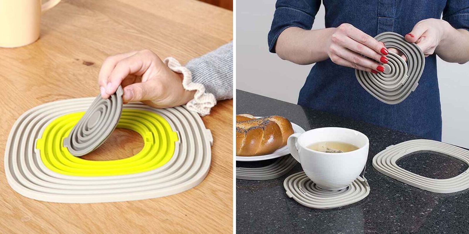 Раскладные подставки для горячих кастрюль и чашек. Удобно, что аксессуары входят друг в друга, как пазл, поэтому в сложенном состоянии займут минимум места.