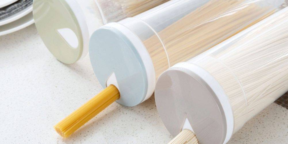Контейнер с крышкой‑дозатором для сыпучих продуктов и расчёта одной порции спагетти. Просто, но как удобно!