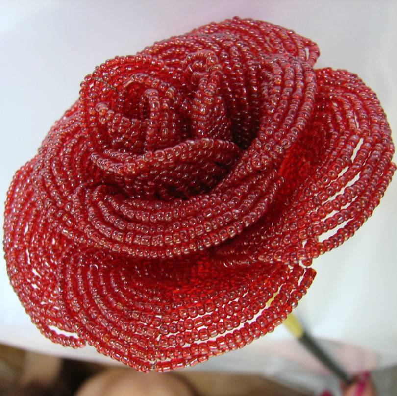 По завершению работы цветы помещаются в горшок следующим образом: стебли «протыкают» пенопласт, находящийся в горшке так, чтобы прочно там закрепиться. Такая поделка из бисера способна заменить красивый цветочек. Это особенно актуально для тех, кто хочет внести в в дизайн своей квартиры какую-то свежую нотку, но понимает, что ухаживать за цветами не будет успевать.