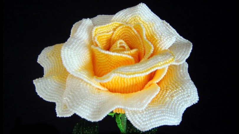 Верх не будет выглядеть законченным без чашелистика розы. Над его созданием и следует поработать на данном этапе. Отрезав приблизительно 75 сантиметров проволоки, сделав ось, можно приступать к нанизыванию. Чтобы все измерения не производились на глаз лучше воспользоваться линейкой или рулеткой, техника зубчатого листа легче дается при соблюдении, каждой мелкой длины.