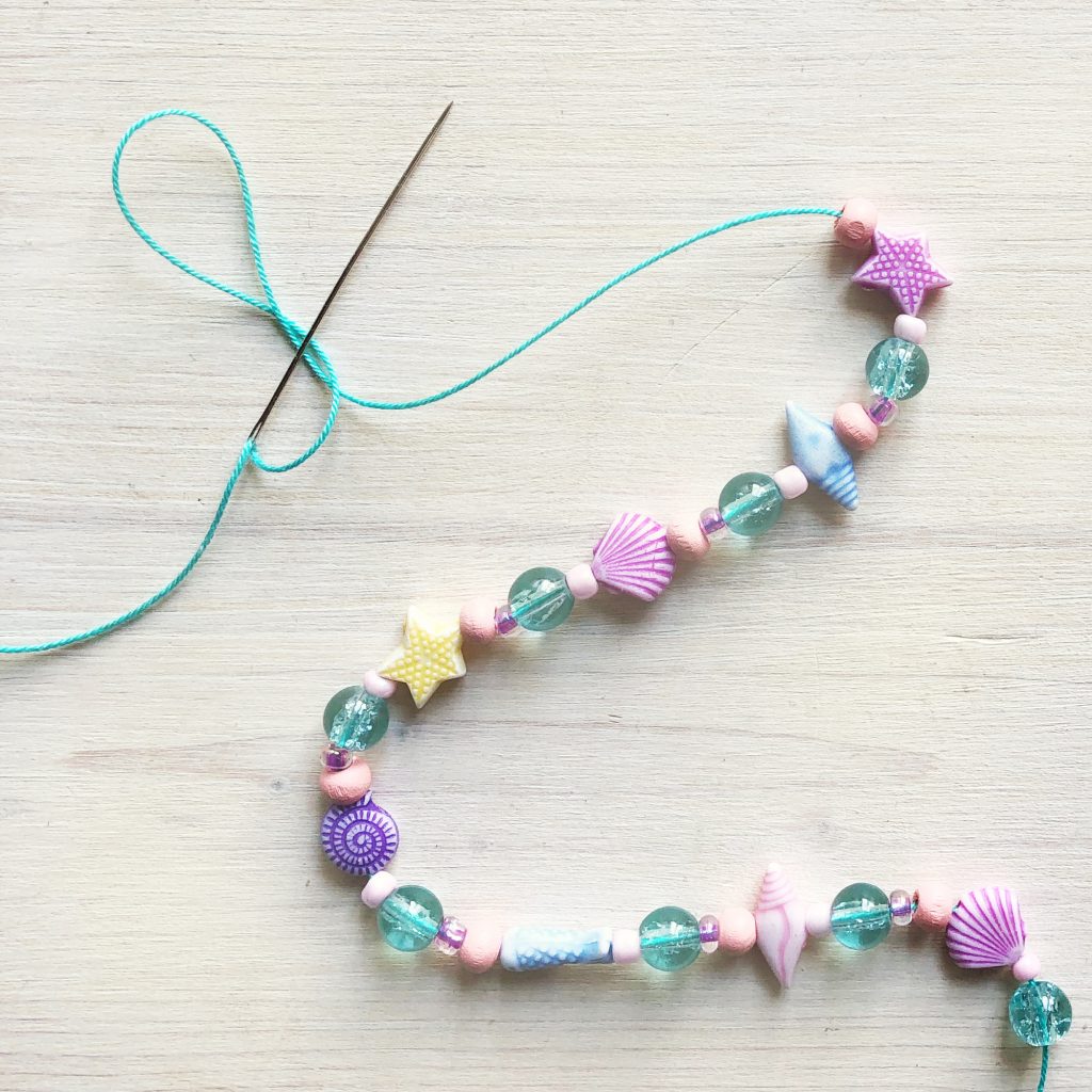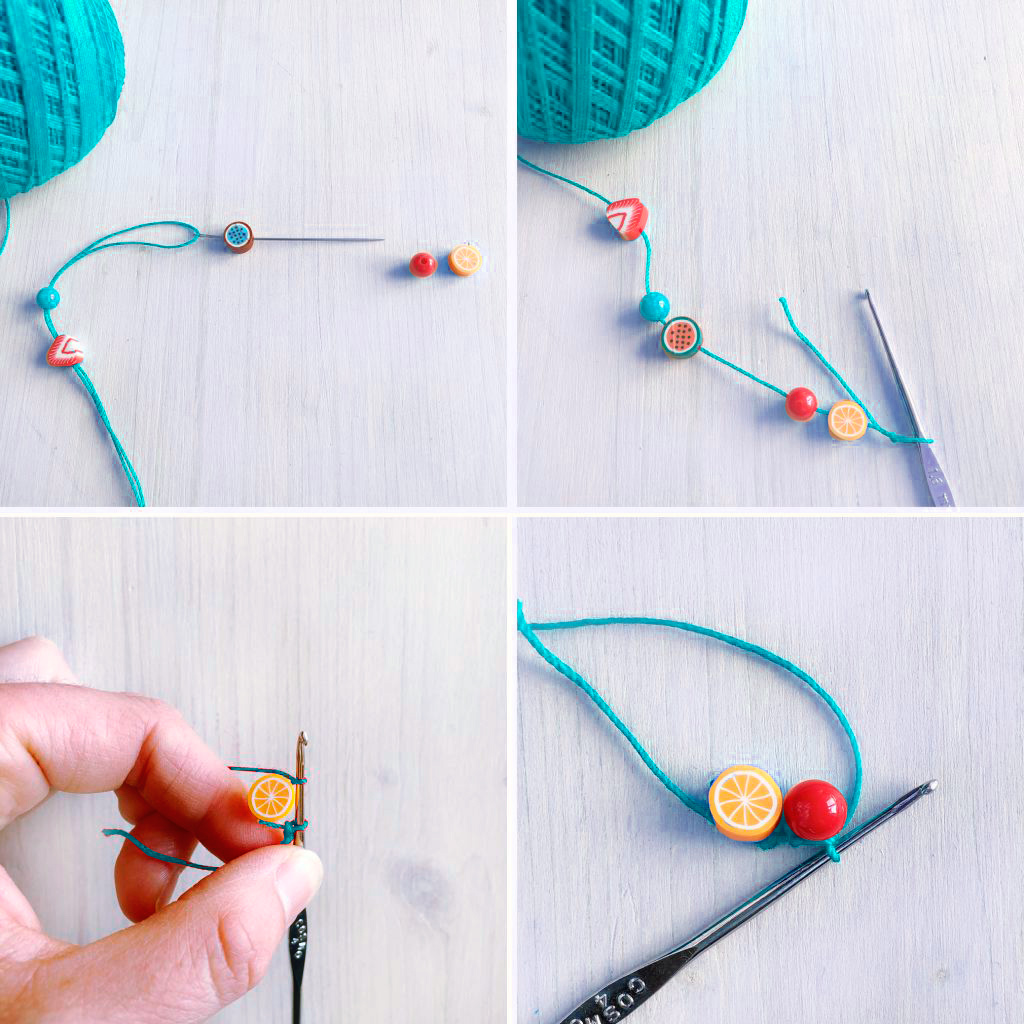 Шаг 1. Сначала насадите бусинки на нитку. Возьмите тонкую пряжу яркого цвета из хлопка. Леску использовать не рекомендуем, она может натирать нежную кожу и неприятно давить при надевании вещей.