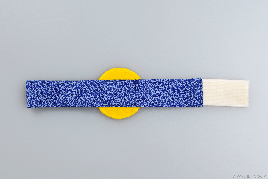 Сложите тканевый прямоугольник пополам по длине лицевой стороной внутрь, сшейте две длинные стороны, переверните лицевую сторону. Расправьте браслет и разгладьте его горячим утюгом. В центре тканевой ленты пришейте кружок из фетра диаметром 5 см. Пришейте резинку сначала к одной короткой стороне ремешка, затем к другой.