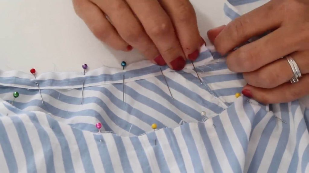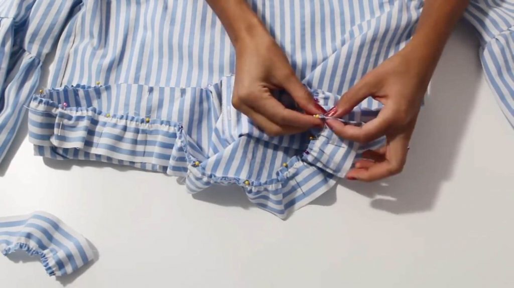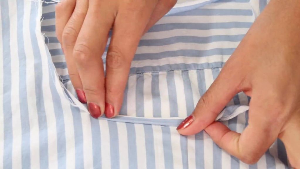 Если вы отрезали верх рубашки по прямой, без закруглений вверх, то отделать вырез не составит труда. Просто подогните его дважды, прострочите, выделив примерно 1 см свободного пространства, чтобы продеть резинку. Втяните ее с помощью застегивающейся булавки и затем выполните ручной шов на участке входа «швейного эластика» либо дострочите.