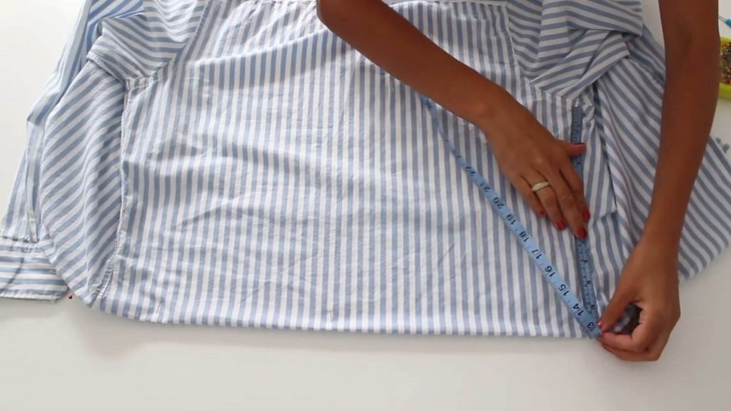 Разглаживаем рубашку утюгом, расправляя складки и помятости. Мужская рубашка у нас не очень большого размера, уменьшать плечи мы не будем. Одеваем рубашку на себя. Берём в руки портновскую булавку и обозначаем (уменьшаем) пройму, а также определяемся с длиной рукава. Учитываем то, что на рукаве у нас будет ещё и волан. Прикладываем сантиметр к полочке — намечаем нужную длину блузки. Записываем на листок и прибавляем 1,5 см. на припуск.