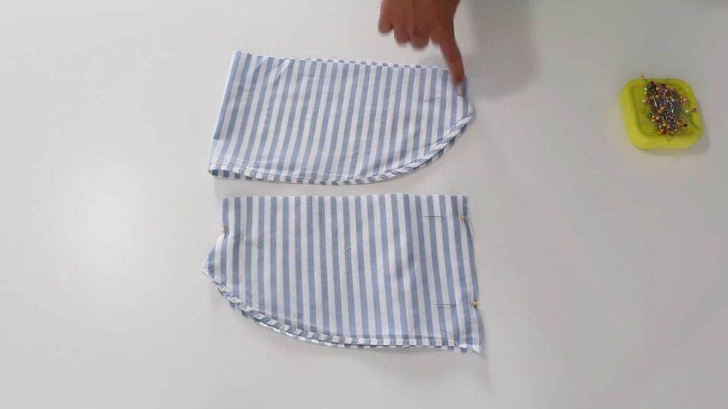 Подошла очередь рукавов. Берём низ рубашки, который мы отрезали в начале мастер-класса. У нас 1 большая деталь (со спинки) и 2 маленькие (с полочек). Большую деталь сгибаем пополам, 2 маленькие детальки складываем друг с другом. Получилось 2 волана для рукавов. Смотрим, чтобы они были симметричны. Сшиваем большую деталь 1 раз, а на маленьких деталях делаем 2 шва.
