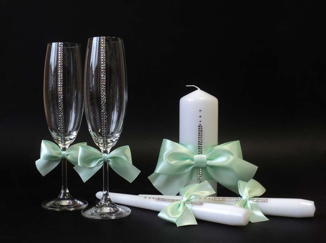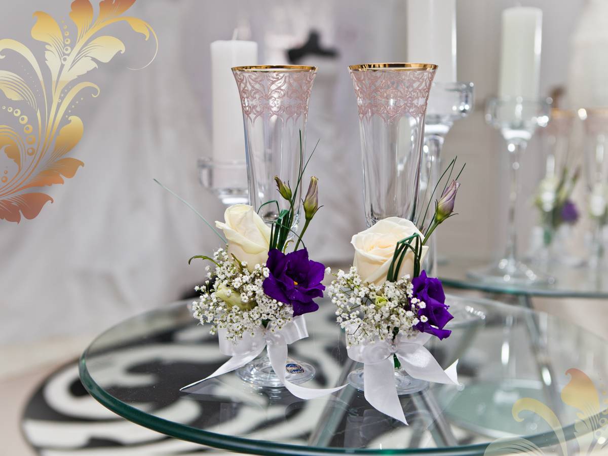 Для свадебных бокалов и шампанского подойдут кружева, витражные краски, перья, лепестки, ленты и многое другое. Экспериментировать на этом поприще в такой день – дело рискованное. Потому, оформление лучше доверить мастерам хэндмэйда.