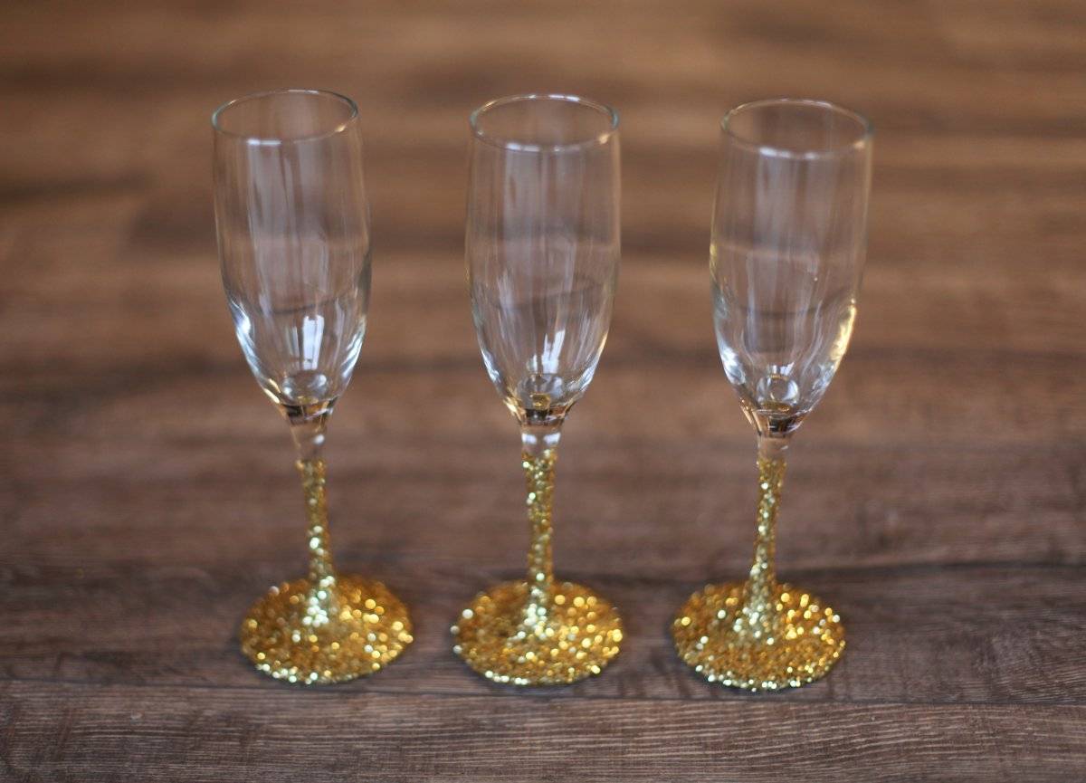 Существует более простая вариация позолоченных бокалов. Достаточно клеем-карандашом нарисовать надпись или узор по стеклу, посыпав сверху блестками. Остатки стряхивают на газету, оставляют полностью высохнуть.
