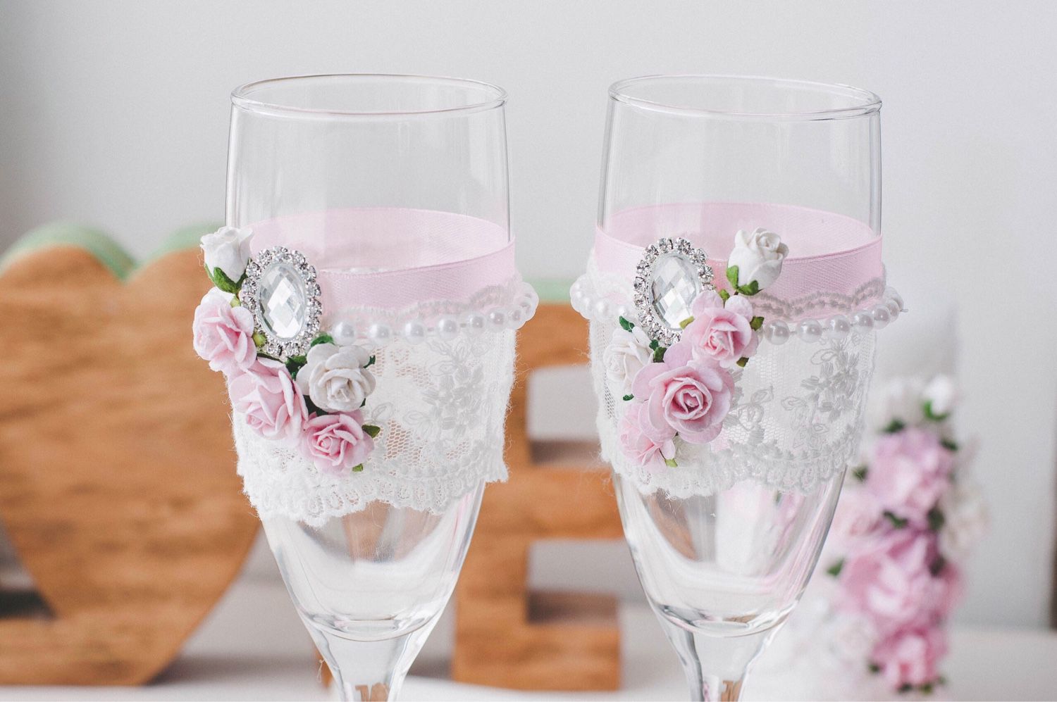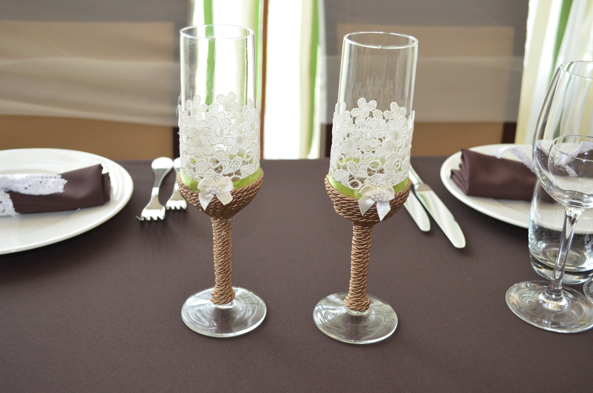 Свадебные бокалы своими руками: Украшение кружевом, тканью