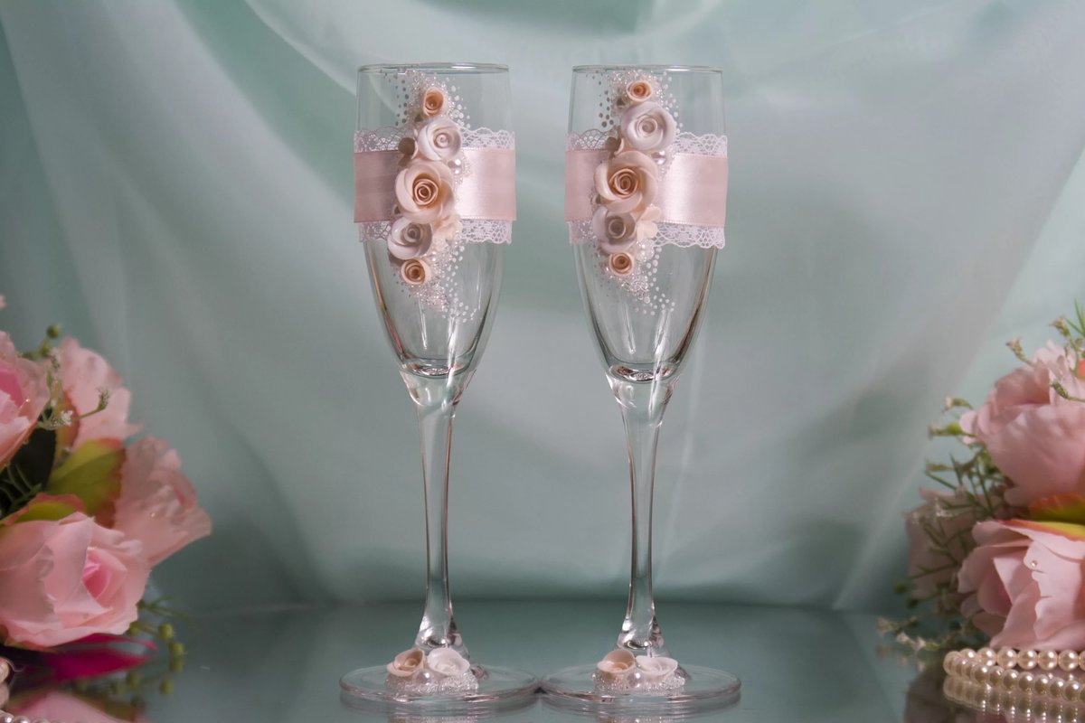 Выбрать фужеры для молодоженов можно кустарного производства или ручной работы. Последний вариант всегда уникален. Необязательно, что он полностью должен быть выполнен на заказ, достаточно декора. Основное требование – украшения должны гармонировать с нарядом невесты и тематикой празднества в целом. Изделия отличаются по типу оформления: