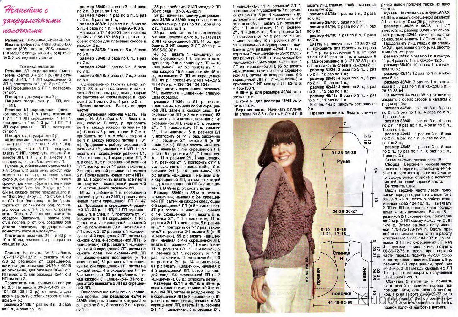 Сравнивая схемы, сделайте убавку для выреза: провязав четыре см, в каждом последующем 4 р. провяжите лиц. 3 и 4 п. 15/17 раз. Также по схеме выполните убавку для пройм: сформировав 7/8,5 см вязаного полотна закройте 6 шт.. В каждом четном р. убавьте 3Х1 п. Выполнив 17,5/20 см, закройте петельки. Левую часть вяжите зеркально по этой же схеме. Для спинки необходимо набрать спицами 88/96 п. Дальше надо вывязать платоч. узором – 1/5 п., ажуром – 85 петелек., снова платочный узор – 1/5 п. По данной технике спицами вяжется 8 р.